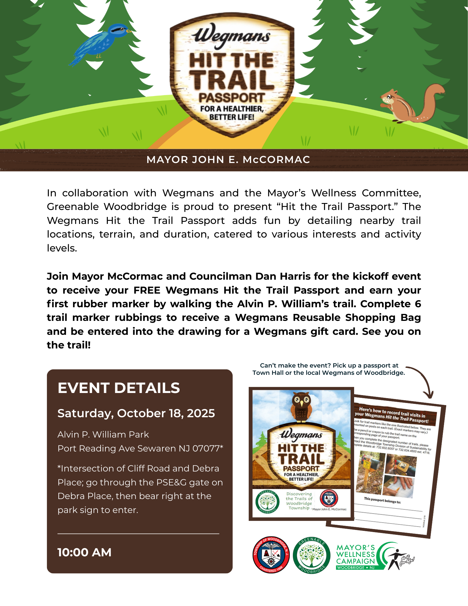 In partnership with Wegmans and the Mayor’s Wellness Committee, Greenable Woodbridge proudly presents the Hit the Trail Passport Program — a fun and interactive way to explore over 10 local parks, trails, and tracks. The passport includes trail details like terrain, distance, and healthy snack tips to keep you energized.