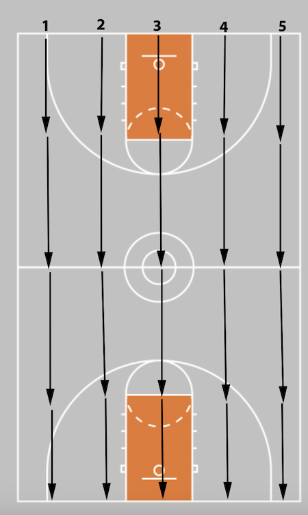 Start on the baseline and have a partner or coach stand on the perimeter. As they pass the ball to the top of the key, sprint out to “close out” on them, chopping your feet and getting into a defensive stance with one hand up to contest the shot. Then shuffle sideways and return to your starting position, repeating the process.